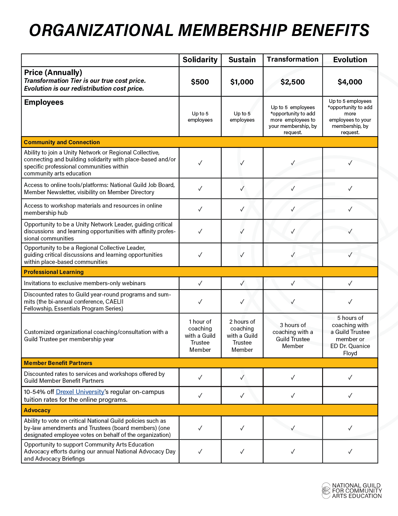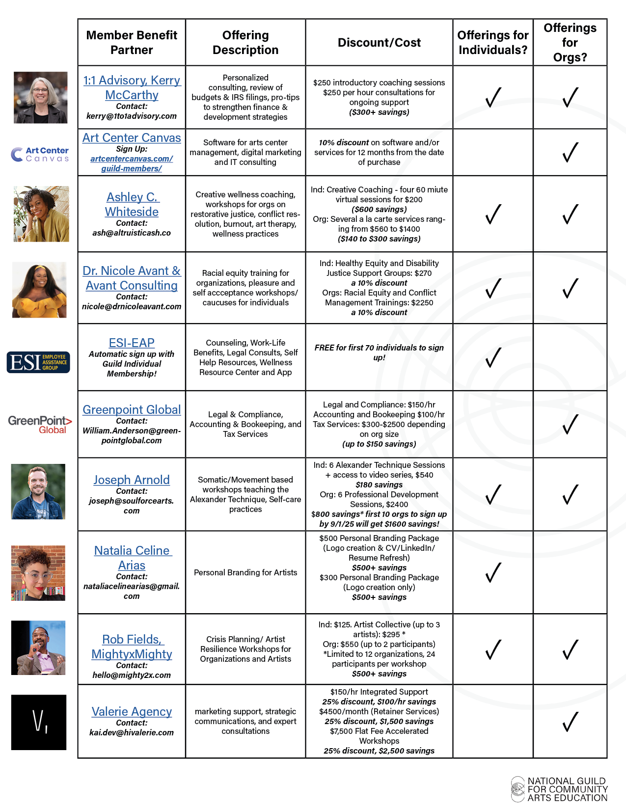 To expand our membership benefits and resources, The National Guild has partnered with a variety of artists, change-makers, organizations, wellness advocates, and education professionals to provide holistic and robust discounted (or included in membership) services to our members. Check them out!