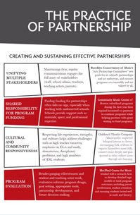 An accompanying resource for The Practice of Partnership: High-Impact Arts Education Partnerships with K-12 Schools, this document gives a concise overview of the report's core findings. Recommendations for practitioners are provided in the areas of "creating and sustaining effective partnerships" and "developing high-impact programs."